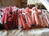 J'ai acheté vingt couleurs pures qu'il me fabrique. Le fil de trame comporte quatre brins de laine. En jouant avec différents fils de différents tons, je vais agrandir la gamme de couleur, la multiplier ; là j'ai fabriqué 68 tons, seulement dans la gamme des rouges.