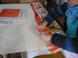 Quand je viens avec les fils, les couleurs c'est relativement facile avec les enfants ! J'y trouve un équilibre. Je fais un métier de solitaire : quand j'observe les plantes je suis toute seule, quand je dessine je suis toute seule, quand je peins je suis toute seule, quand je tisse... je n'ai pas envie d'oublier les êtres humains. Ça m'équilibre. Et pédagogiquement, j'ai appris énormément.
