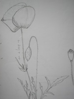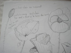 C. L. : Dans mes observations, il y a beaucoup de dessins, de croquis, quelques relevés de couleurs et quelquefois un petit bout de la plante réellement dessiné, la plupart du temps accompagnés de mots. Je précise avec des mots tout simples, mon trait n'étant pas tout à fait juste, alors je corrige avec des mots : "un peu plus de galbe là", et puis les questions que ça me pose.