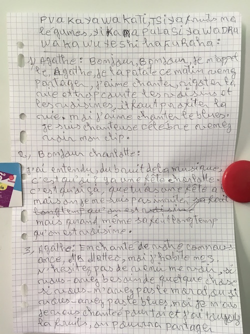 Amande : Quand il y a des mots qui accrochent, c’est bien de pouvoir changer. Ce qui est intéressant aussi, c’est le travail sur la langue, les nuances, comment on va chercher un synonyme, une expression imagée en français qui corresponde à ce qui existe en arabe ou en comorien.