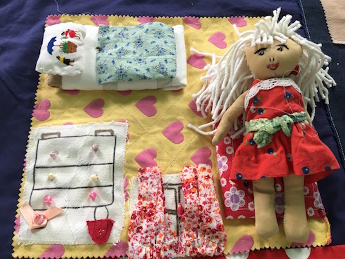 Samia : C’est une histoire qu’on raconte sur un tapis, les personnages sont en trois dimensions et ils évoluent au fil du tapis. Mais cet outil n’était utilisé que pour représenter un album existant, par exemple La Grenouille à la grande bouche. L’idée ça a été de s’approprier cet espace de narration à l’horizontale mais pour créer une histoire qui puisse être racontée par tous. On a réfléchi avec le groupe de l’atelier couture qui démarrait à ce moment-là et on a pensé que l’espace de la maison était l’espace idéal à partir duquel on pouvait raconter plein d’histoires qui parlent de soi, qui parlent de l’autre, universelles. On a commencé par construire une maison en tissu. Ce qui est intéressant lorsqu’on crée des objets comme ça, c’est que c’est à la fois un soutien et une source d’inspiration pour l’écriture. On est parties d’abord de l’objet et en fabriquant on a commencé à envisager des histoires. Je fais ça aussi avec les enfants, on fabrique un objet et après on raconte l’histoire de cette création, ça aide.