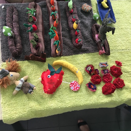 Samia sort les marionnettes du sac et poursuit : Toute la partie où Mattéo se prépare, et où il est très stressé parce qu’il ne connait personne, nous l’avons inventée. C’est Nana, la couturière, qui faisait Charlotte, il y avait aussi Juliette la courgette, Raymond le champignon, « tout rond, tout mignon ». Ça marche super bien avec les enfants. Quand on va dans une école, on leur laisse toujours après prendre les marionnettes et spontanément ils commencent à les faire parler. Mais on n’a pas pu présenter l’histoire aux enfants qui avaient écrit la trame parce que leur classe s’est dispersée.